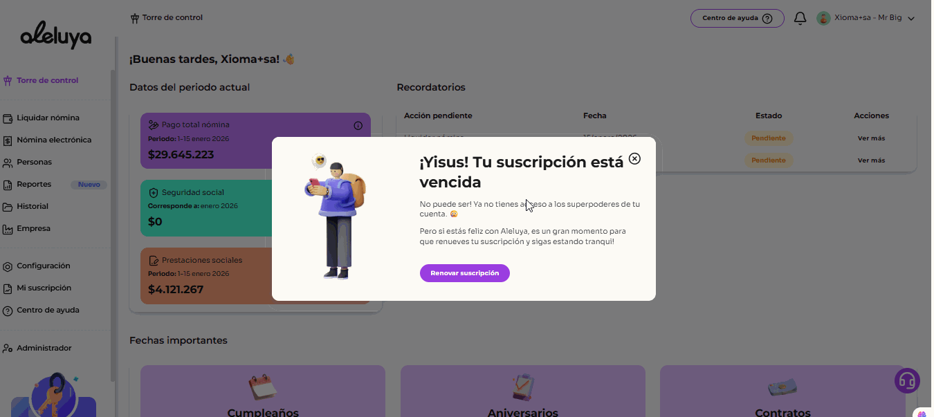 Sonríe, conoce la fecha de tu próximo cobro de suscripción. Ahí te va! Accede a tu suscripción. Para saber cuál es la fecha de corte de tu suscripción a Aleluya, sigue estos sencillos pasos: En la esquina superior derecha del nombre de la empresa, ...