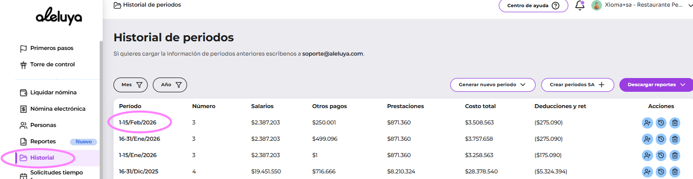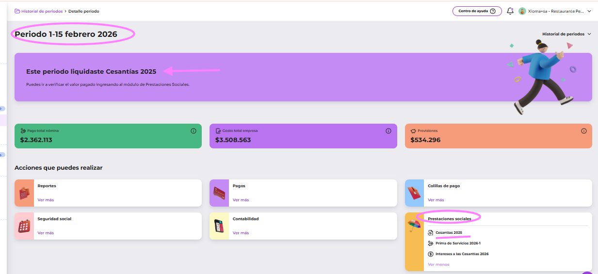 Haz clic en el periodo de febrero (o el periodo en el que liquidaste las cesantías diciembre, enero o febrero.). - Al ingresar al periodo, podrás ver la notificación de "Este periodo liquidaste las cesantías 2025". -Fíjate que sea la prestación del año que deseas liquidar, Lee con atención.