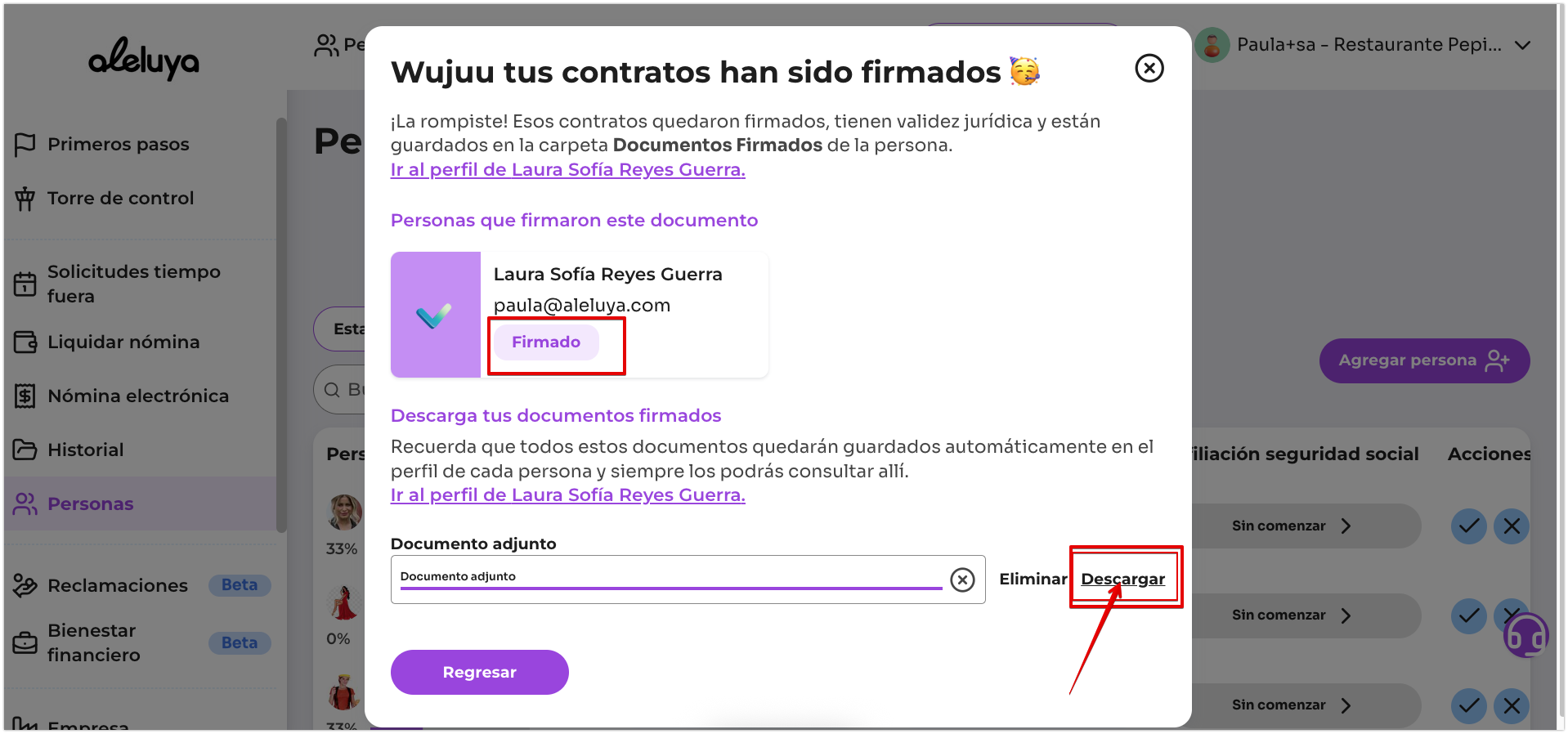 Con Aleluya, enviar el contrato laboral a tu trabajador es 100% digital 📲. Y lo mejor: podrá firmarlo con todo el respaldo legal gracias a ZapSign ⚖️.