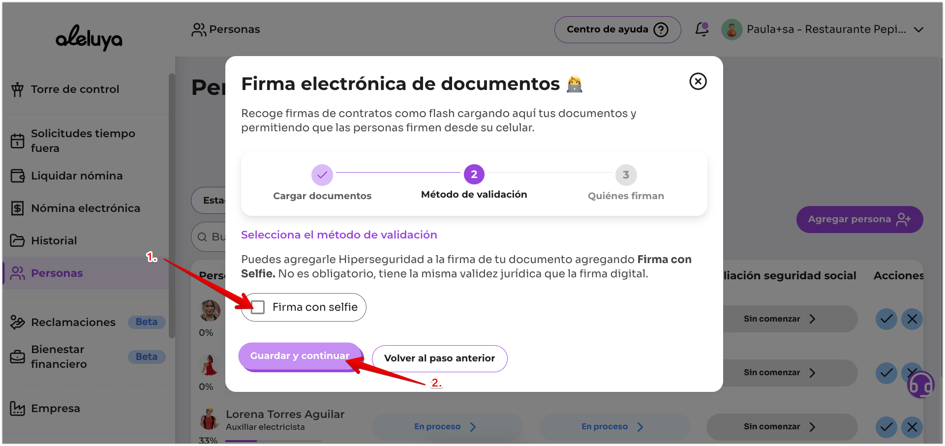3. En métodos de validación, es opcional si deseas que aparte de la firma de tu trabajador, quieres que también se tome una selfie, según lo que desees, haz clic en Guardar y continuar.