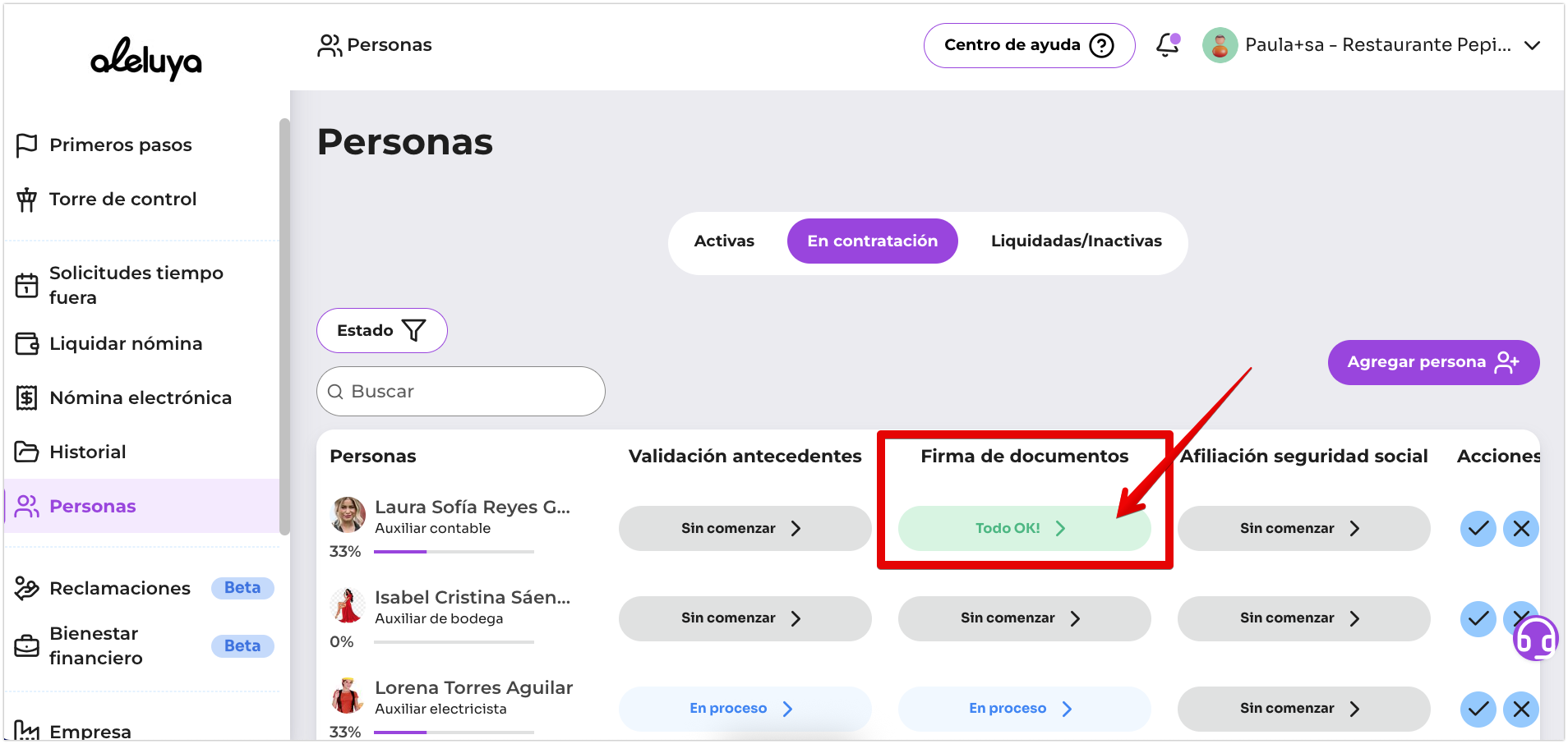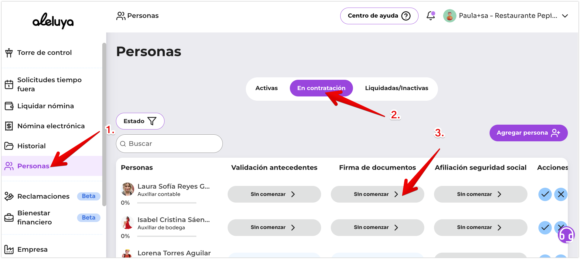 1. Dirígete a Personas - En contratación y ubica a tu trabajador. En la tercera columna llamada Firma de documentos, haz clic en el botón Sin comenzar.