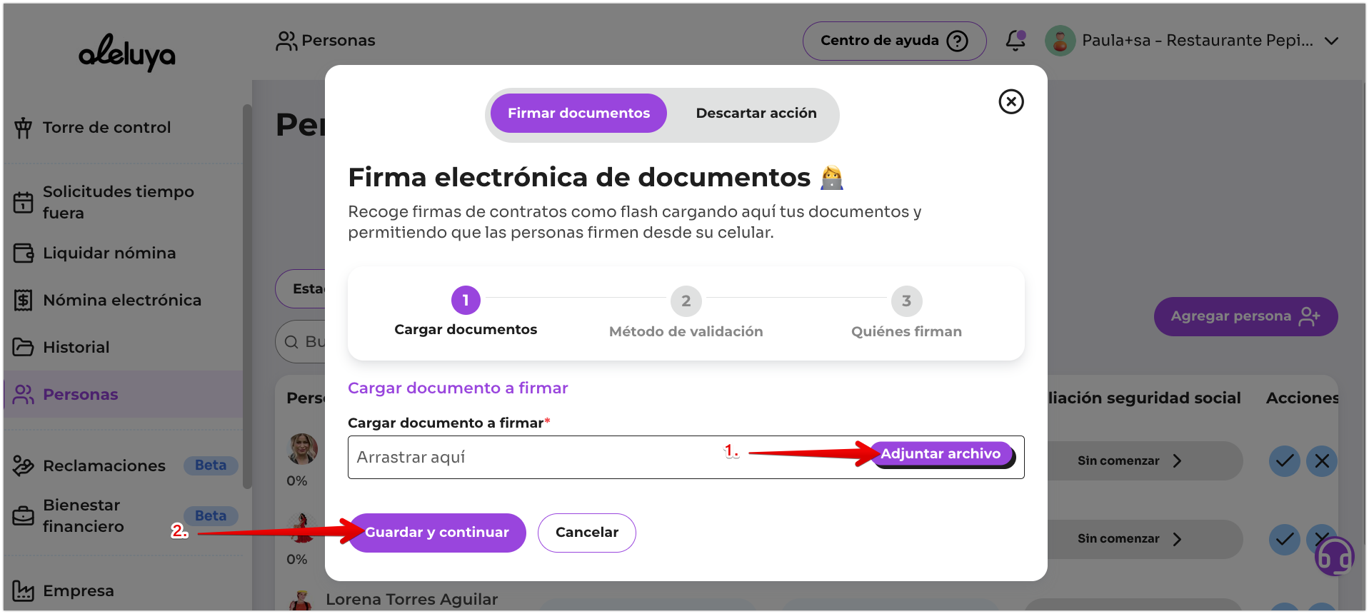 2. Carga el contrato laboral haciendo clic en Adjuntar archivo, finalmente haz clic en Guardar y continuar
