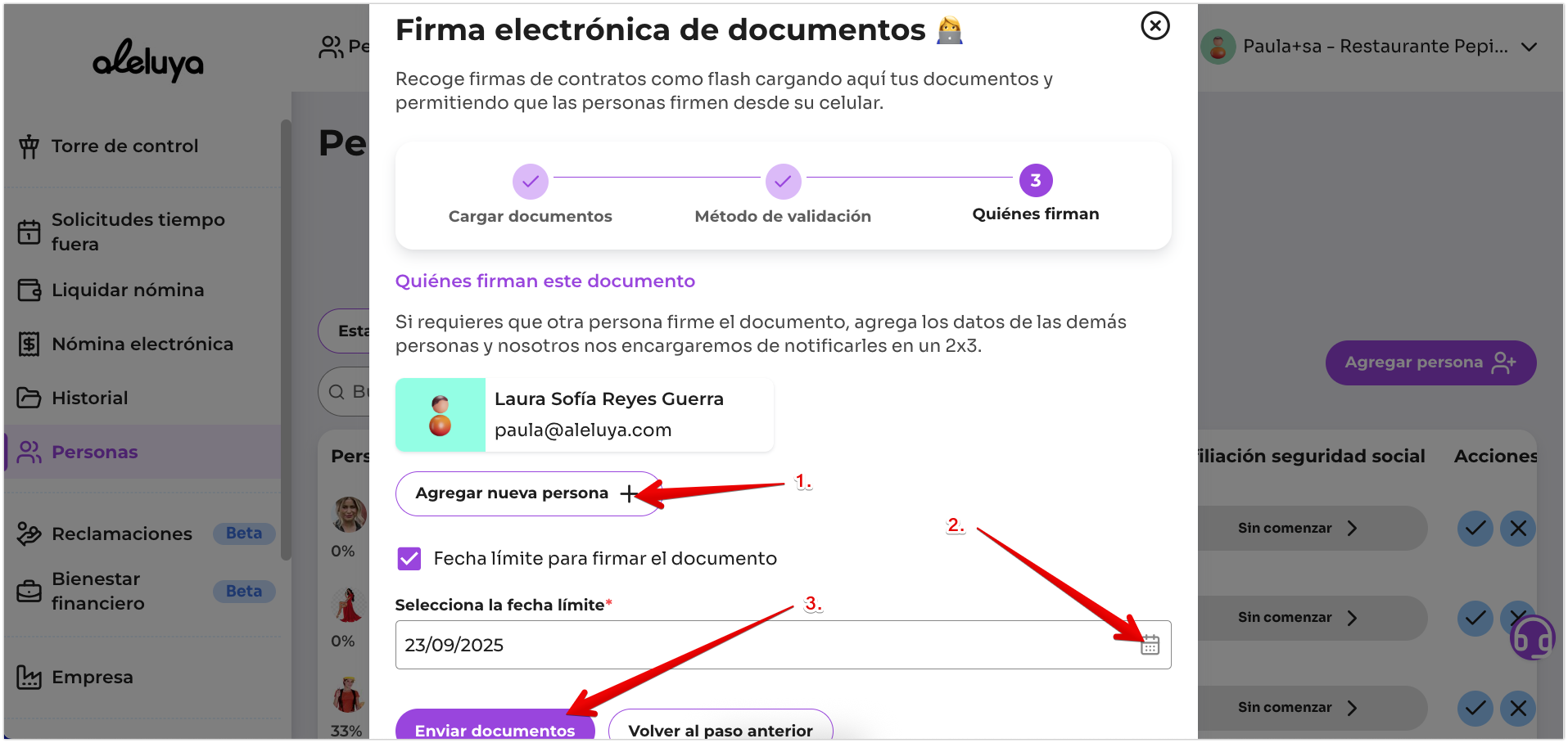4. Aleluya, por defecto, trae el correo electrónico que registraste de tu empleado al momento de su creación, si deseas agregar otra persona a firmar, haz clic en Agregar nueva persona, seguido, debes seleccionar hasta qué fecha darás plazo para la firma del contrato. Finalmente, haz clic en Enviar documentos.