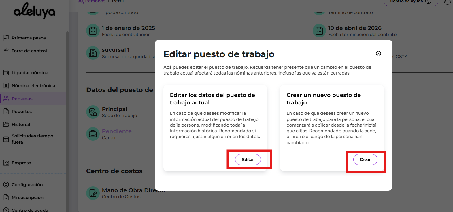 Por eso lanzamos una mejora poderosa en Aleluya🩵💜: ahora puedes crear o editar puestos de trabajo desde el perfil del empleado y guardar el historial de cambios de sede, área o cargo con fecha específica.
