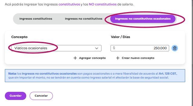 Si entregas viáticos ocasionales no salariales, debes registrarlos como Ingresos no constitutivos ocasionales, igual que los ingresos no salariales ocasionales.