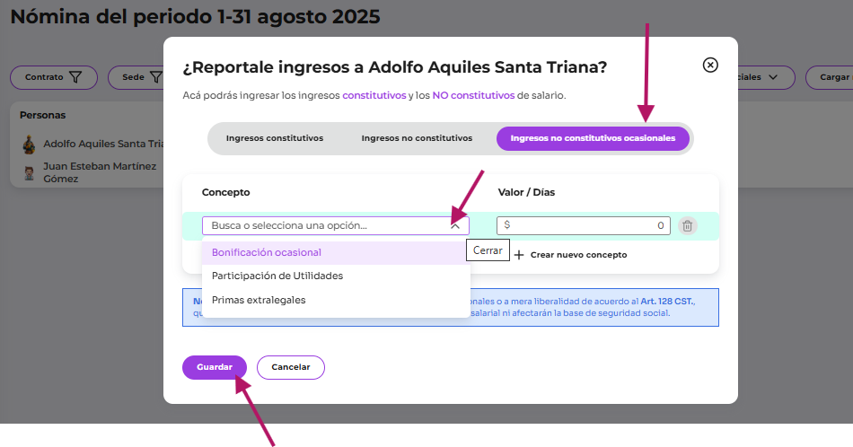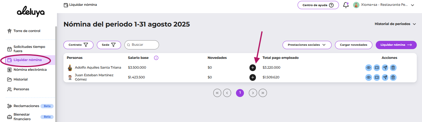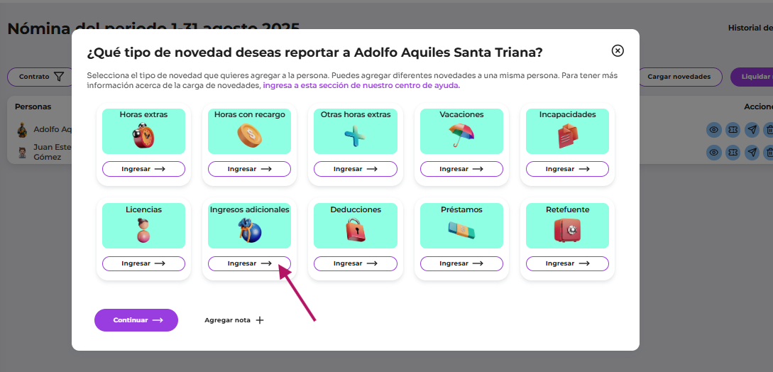 - Entra al módulo de Novedades - Ingresos en Liquidar nómina, dando clic en el mas