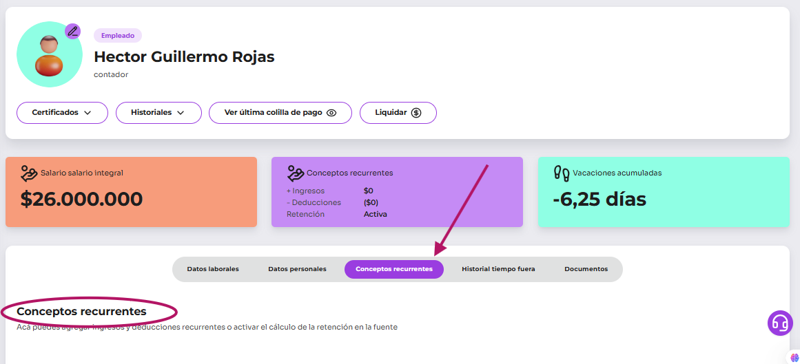 Conceptos recurrentes (ingresos, deducciones y préstamos) de un empleado