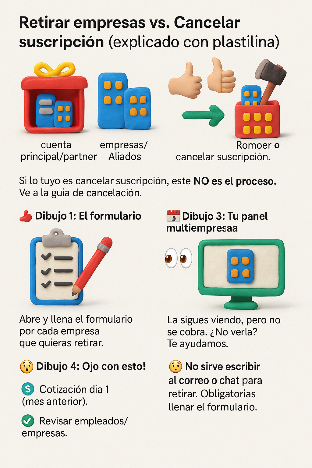 - Retirar empresas = sacar a las empresas hijas de las naguas de mamá (empresa principal) ➜ no se cobran, pero se ven en el panel (si quieres, te ayudamos a que no se vean).